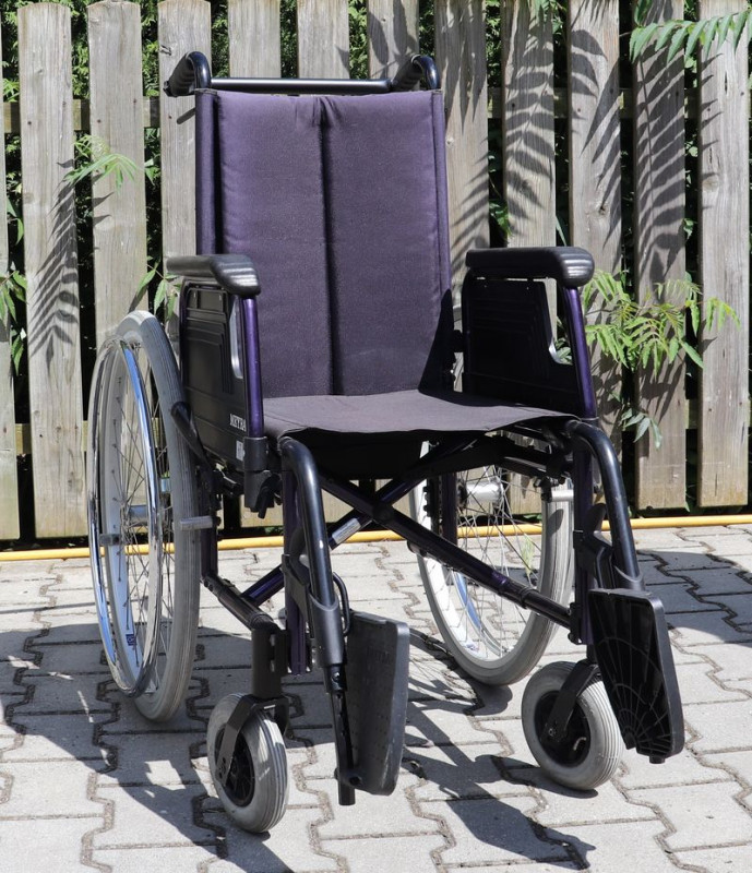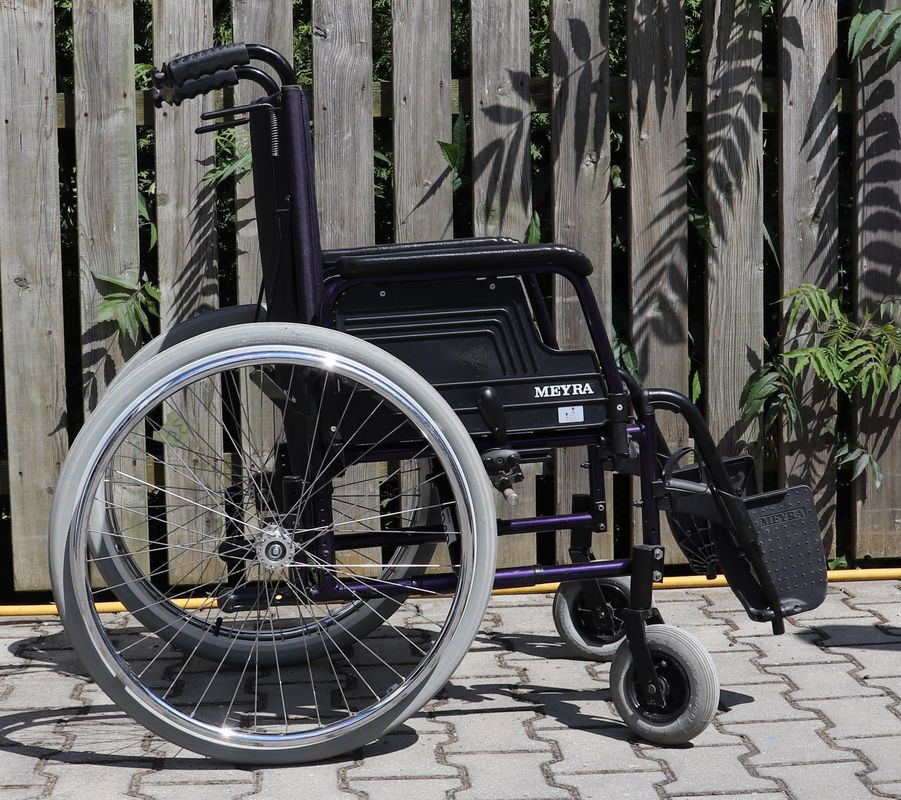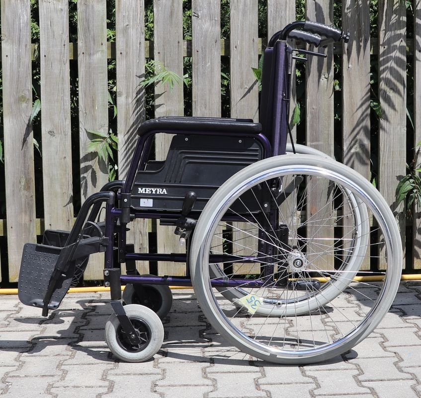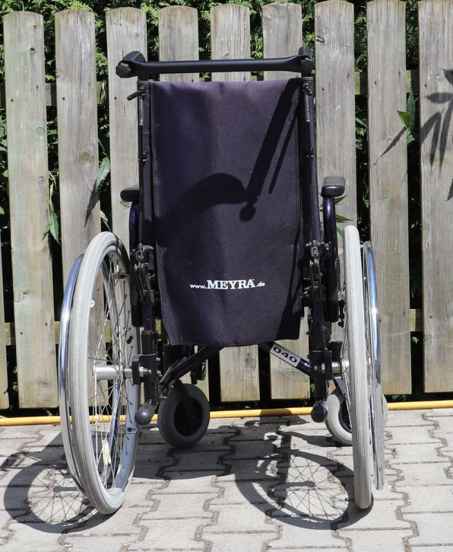 Mechanický invalidní vozík Meyra.Šíře sedu 40 cm.Hloubka sedu 42 cm.Výše zad 48 cm.Celková šíře 63 cm.Přední i zadní kola nafukovací.