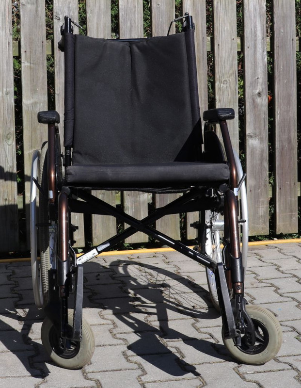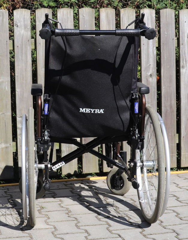 Mechanický invalidní vozík Meyra.Šíře sedu 48 cm.Hloubka sedu 46 cm.Výše zad 56 cm.Celková šíře 70 cm.Přední i zadní kola plná.Rychloupínáky.